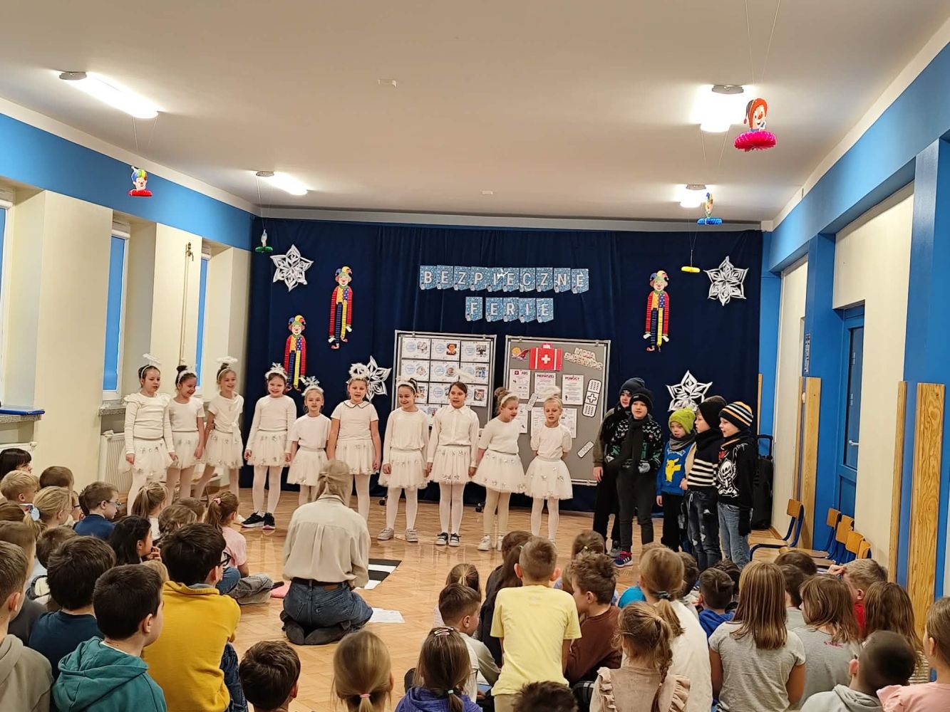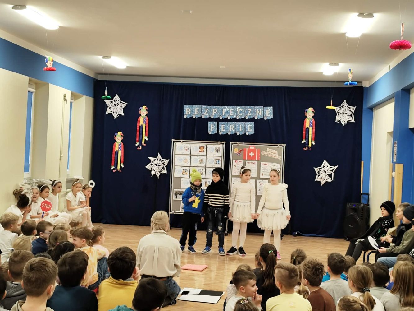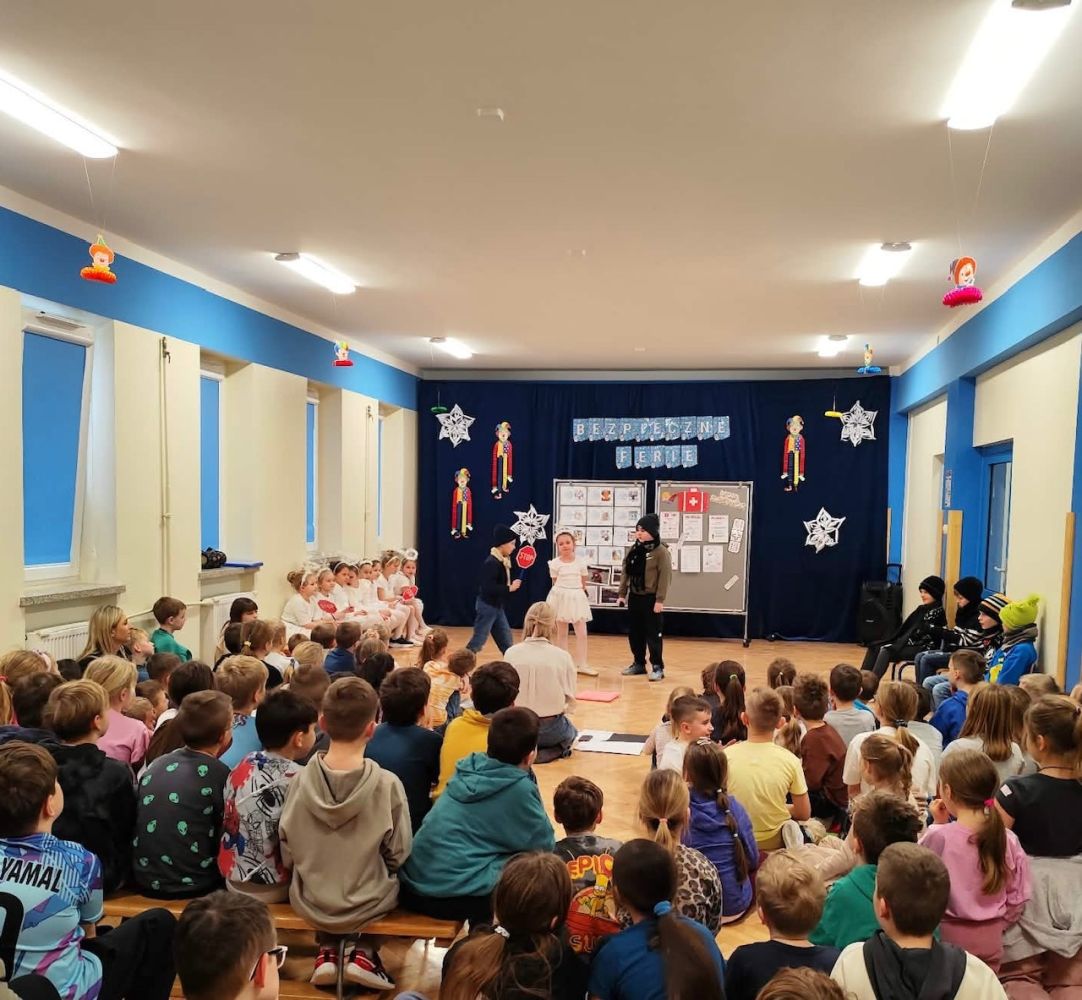 Oddział przedszkolny oraz uczniowie klas 1–3 uczestniczyli w przedstawieniu edukacyjnym pt. „Bezpieczne Ferie”, przygotowanym przez uczniów klasy 2a w ramach zajęć teatralnych.