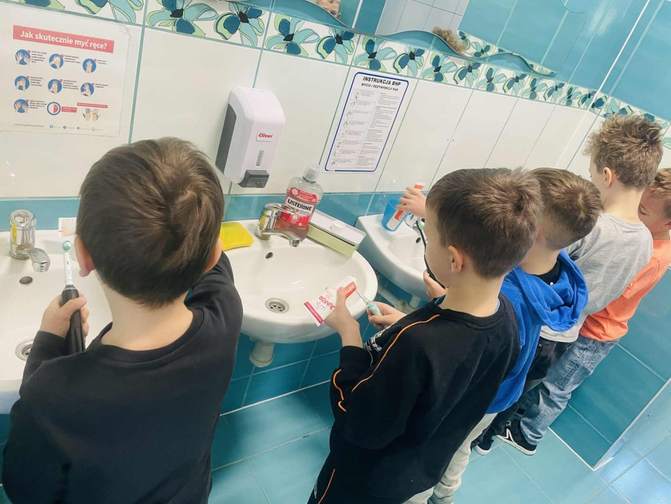 Dzieci przyniosły do szkoły szczoteczki i pasty, a pod okiem nauczyciela ćwiczyły prawidłowe mycie zębów. W zabawny sposób utrwalały zasady higieny, śpiewając piosenkę „Szczotko, szczotko hej, szczoteczko”.