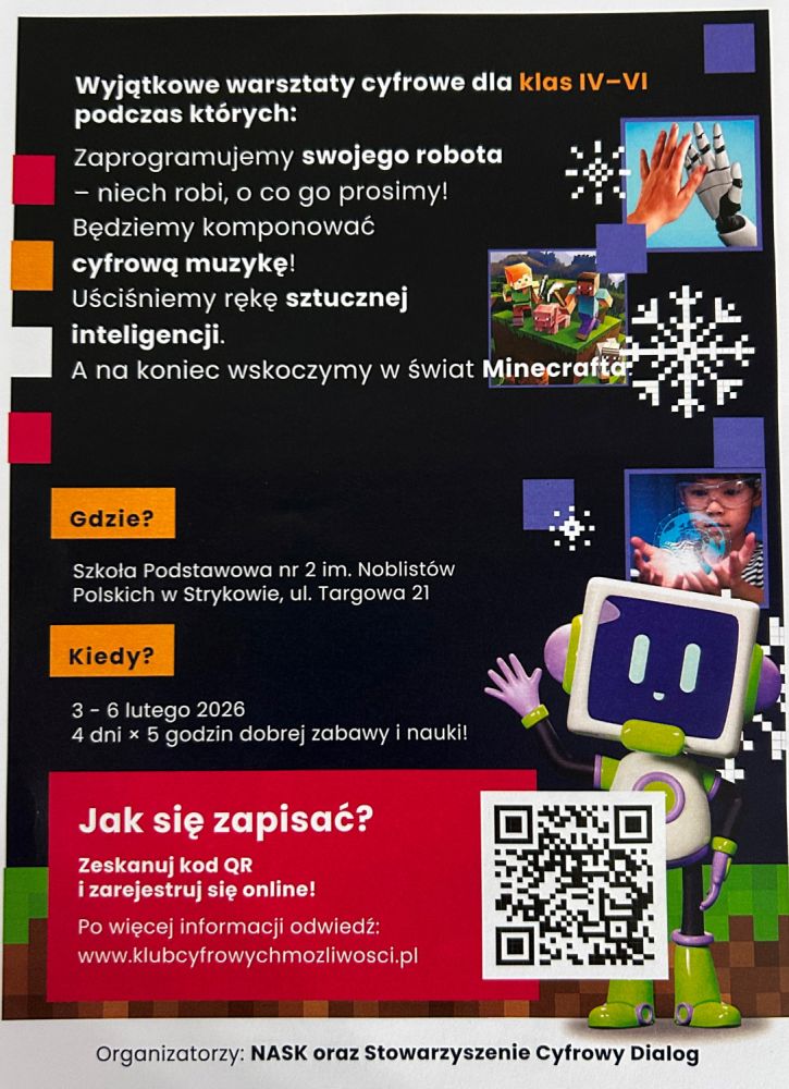 Nasza szkoła we współpracy z NASK - Państwowym Instytutem Badawczym - organizuje dla uczniów wyjątkowe ferie zimowe. W ramach programu przygotowano zajęcia rozwijające kompetencje cyfrowe, warsztaty z bezpieczeństwa w sieci oraz aktywności, które łączą naukę z dobrą zabawą.