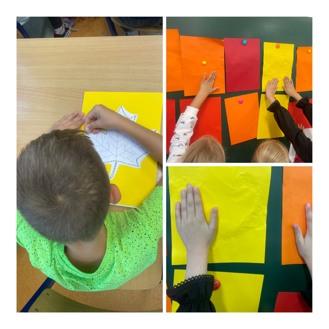Pierwszym zadaniem było perforowanie – dzieci za pomocą szpilki wykonały dziurki wzdłuż konturu liścia. Powstała w ten sposób ciekawa faktura, którą uczniowie mogli nie tylko zobaczyć, ale też dotknąć i poczuć pod palcami. Zajęcia dostarczyły wiele radości i pobudziły ciekawość poznawczą.