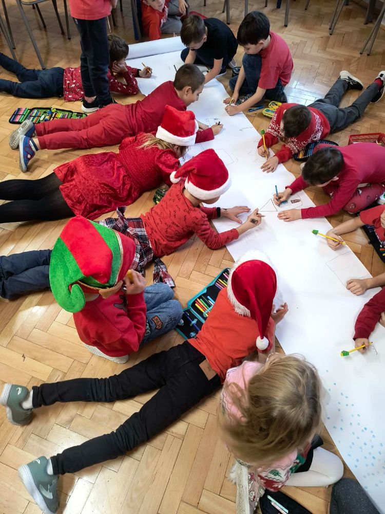 Podczas zajęć uczniowie tworzyli bajkowy świat Mikołaja za pomocą własnejwyobraźnioraz różnorodnych przyborów plastycznych. W ich pracach pojawiły się domki elfów, sanie pełne prezentów, renifery i choinki.