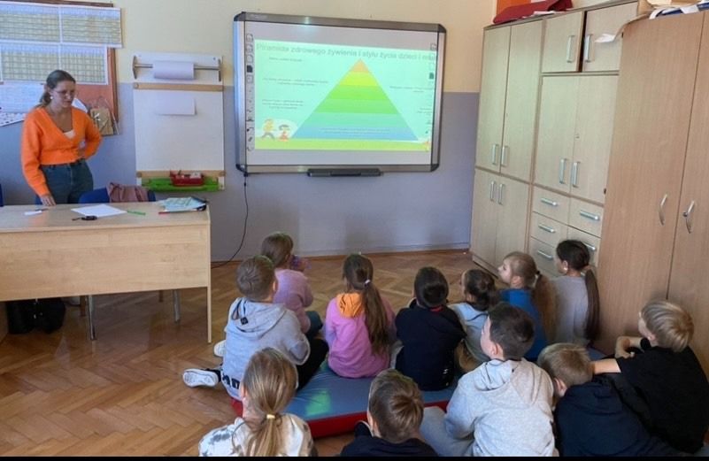 Jednak praca pani pielęgniarki to szerszy zakres działania. Przekonali się o tym uczniowie klasy 3a podczas spotkania, na którym szkolna pielęgniarka omówiła z nimi jak prowadzić zdrowy tryb życia, jak ważne jest prawidłowe odżywianie, sen i wypoczynek. Uczniowie z uwagą oglądali prezentację przygotowaną przez panią Kamilę Wanat. Padło też mnóstwo pytań ze strony dzieci.