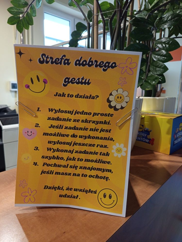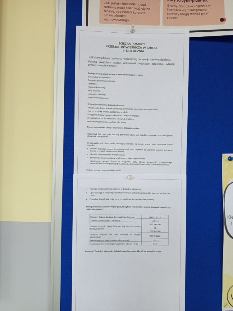 W ramach Tygodnia Przeciwdziałania Przemocy Rówieśniczej uczniowie mieli możliwość zapoznania się z informacjami na temat konsekwencji stosowania przemocy oraz na temat tego gdzie udać się po pomoc w przypadku doświadczania lub bycia świadkiem przemocy. Systematycznie prowadzone są również zajęcia w klasach poruszające tematykę relacji i radzenia sobie z przemocą. Ponadto uczniowie wspólnie tworzyli plakaty wyrażające Ich niezgodę na przemoc w szkole. Mogli również udzielić wsparcia i okazać życzliwość swoim koleżankom i kolegom czerpiąc inspirację ze strefy dobrego gestu.