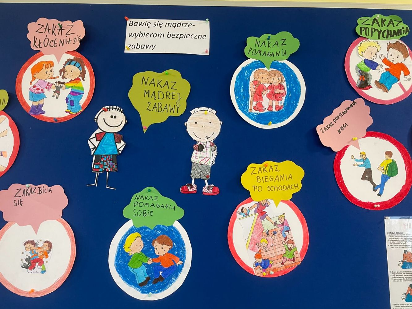 Przygotowane plakaty zostały rozwieszone na korytarzu szkolnym, aby każdego dnia przypominały wszystkim o bezpiecznej i zgodnej zabawie.