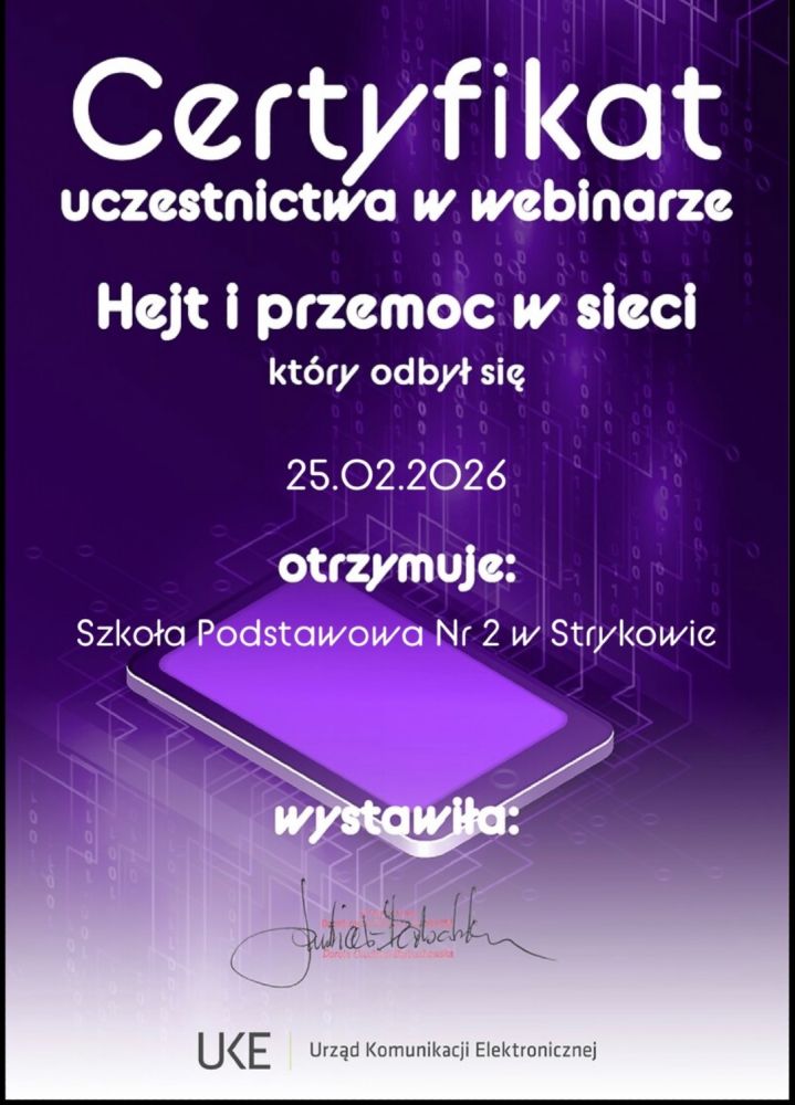 Dnia 25.02.2026 r. uczniowie naszej szkoły wzięli udział w lekcji online prowadzanej przez Urząd Komunikacji Elektronicznej pt. „Hejt! Przemoc w sieci”. Zajęcia odbyły się w formie lekcji online i były poświęcone wyłącznie problemowi hejtu w sieci.