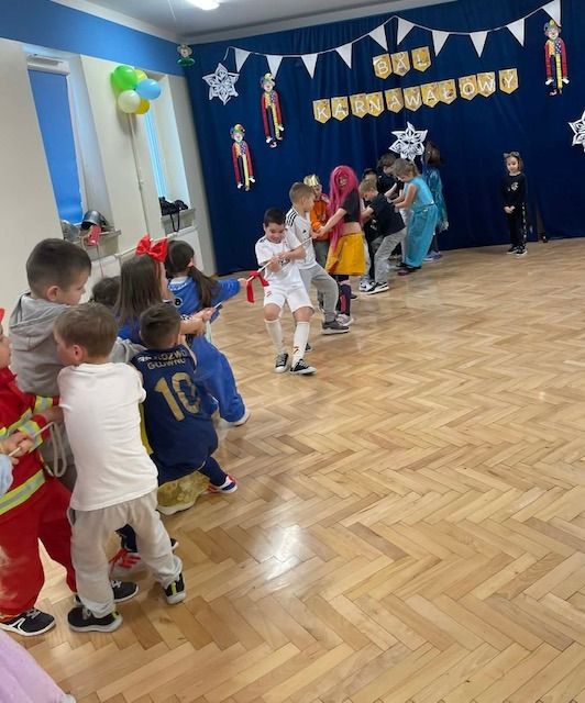 Dzieci z ogromnym entuzjazmem brały udział w tańcach, zabawach ruchowych i konkursach, które dostarczyły im wiele radości i pozytywnej energii. Bal był doskonałą okazją do integracji, rozwijania kreatywności oraz wspólnego, beztroskiego świętowania karnawału.