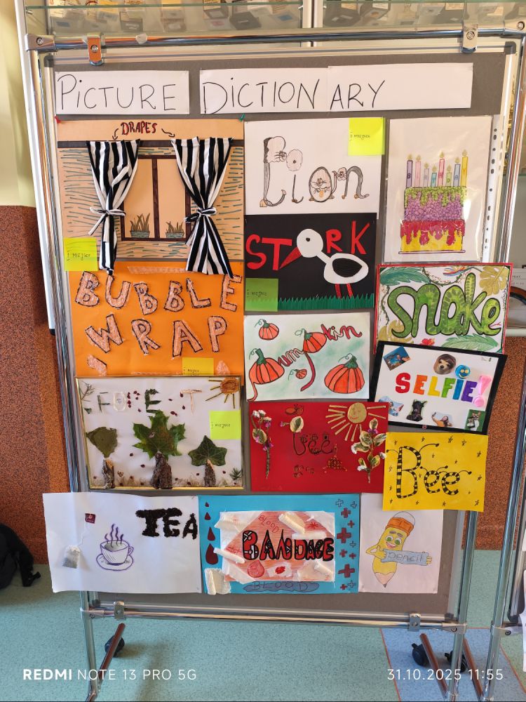 W październiku w naszej szkole odbył się konkurs języka angielskiego „Picture Dictionary”, w którym uczniowie przygotowywali własne ilustrowane słowniczki obrazkowe. Celem konkursu było rozwijanie kreatywności, wzbogacanie słownictwa oraz zachęcanie do samodzielnej pracy z językiem.