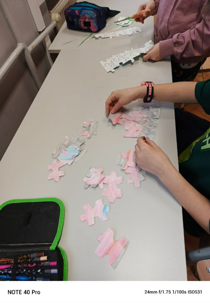 Z okazji Międzynarodowego Dnia Puzzli uczniowie brali udział zajęciach plastycznych łączących zabawę orazćwiczenia koncentracji. Dzieci malowały własne puzzlea później je wycinały, ucząc się przy tym cierpliwości oraz zręczności.