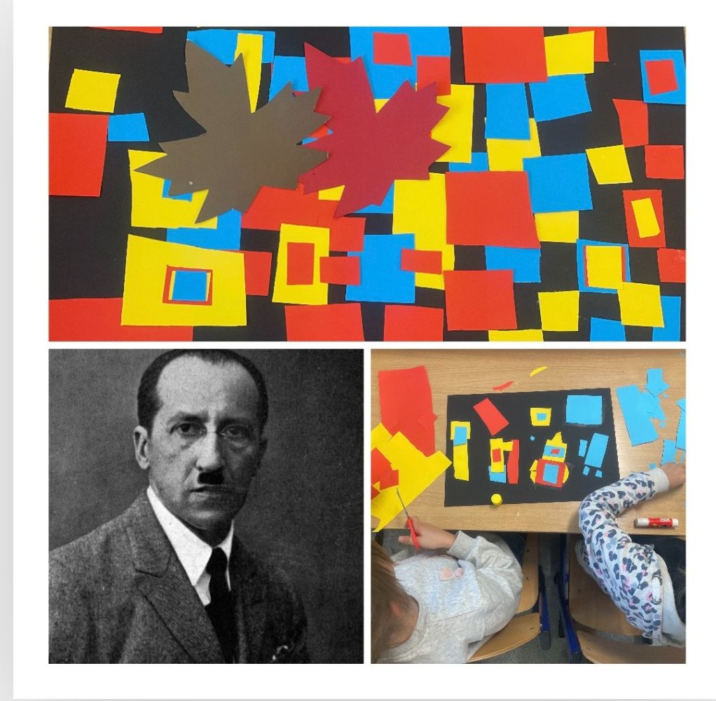 Kolejnym zadaniem było poznanie twórczości malarza Pieta Mondriana, który tworzył abstrakcyjne kompozycje z pionowych i poziomych linii oraz prostokątów w podstawowych kolorach. Zainspirowani jego stylem, uczniowie wykonali własne dzieła – kompozycje z kolorowych kwadratów i prostokątów, które samodzielnie wycinali i układali na kartkach. Efektem były wyjątkowe prace pełne harmonii i radości tworzenia.