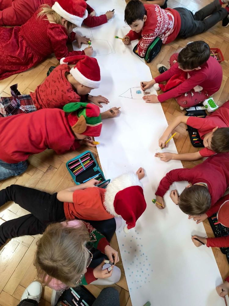 Podczas zajęć uczniowie tworzyli bajkowy świat Mikołaja za pomocą własnejwyobraźnioraz różnorodnych przyborów plastycznych. W ich pracach pojawiły się domki elfów, sanie pełne prezentów, renifery i choinki.