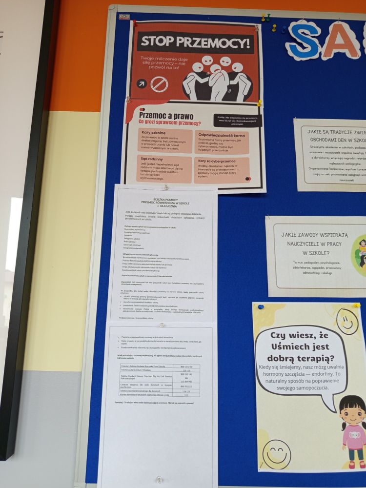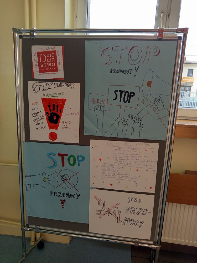 W ramach Tygodnia Przeciwdziałania Przemocy Rówieśniczej uczniowie mieli możliwość zapoznania się z informacjami na temat konsekwencji stosowania przemocy oraz na temat tego gdzie udać się po pomoc w przypadku doświadczania lub bycia świadkiem przemocy. Systematycznie prowadzone są również zajęcia w klasach poruszające tematykę relacji i radzenia sobie z przemocą. Ponadto uczniowie wspólnie tworzyli plakaty wyrażające Ich niezgodę na przemoc w szkole. Mogli również udzielić wsparcia i okazać życzliwość swoim koleżankom i kolegom czerpiąc inspirację ze strefy dobrego gestu.