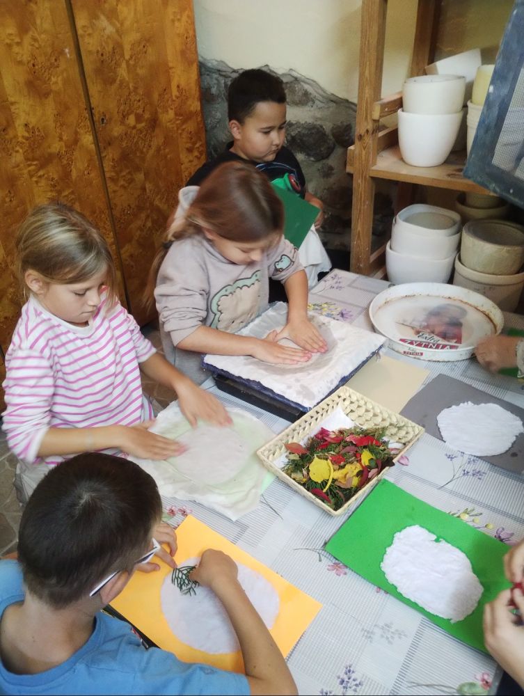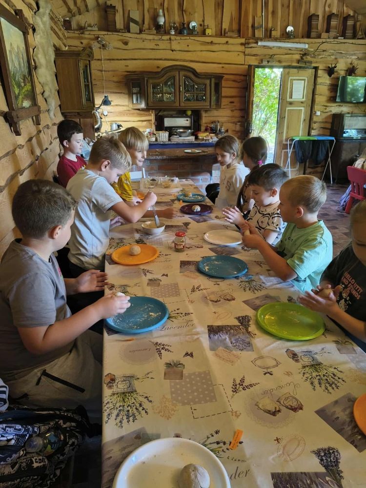 Ważnym punktem programu naszego pobytu w „Michałówce” był udział w zajęciach warsztatowych „Od ziarenka do bochenka”, podczas których dzieci rozpoznawały różne rodzaje zbóż oraz poznały etapy przygotowywania wypieku chleba. Każdy samodzielnie formował i ozdabiał chlebek, który po upieczeniu i zapakowaniu zabrał do domu. Drugie zajęcia edukacyjne - „Manufaktura papieru czerpanego” przybliżyły dzieciom sposób wytwarzania papieru ręcznie poprzez formowanie z masy celulozowej (pulpy) za pomocą specjalnego sita. Własnoręcznie zrobiony (czerpany) papier został ozdobiony kwiatkami i listkami. Barwne kompozycje zabraliśmy ze sobą do Strykowa.