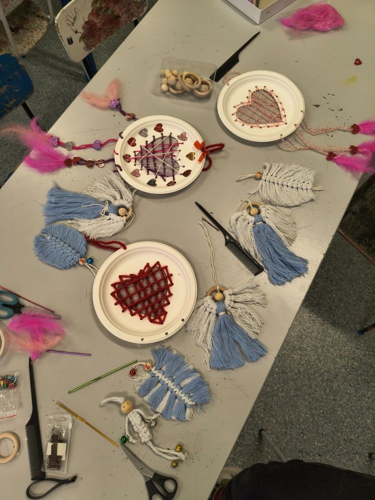 Niektóre z węzłów trzeba było poprawić, jednak chwila cierpliwości i skupienia wystarczyła. Dzieci z zaangażowaniem i niezwykłą kreatywnością tworzyły makramowe aniołki oraz walentynkowe łapacze snów z wykorzystaniem sznurka bawełnianego, włóczki oraz naturalnych materiałów.